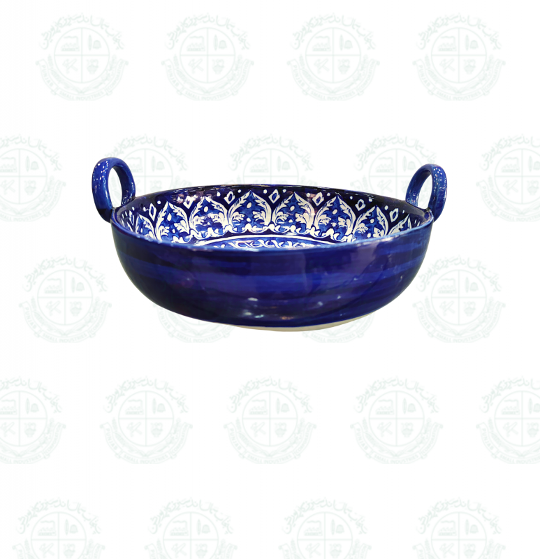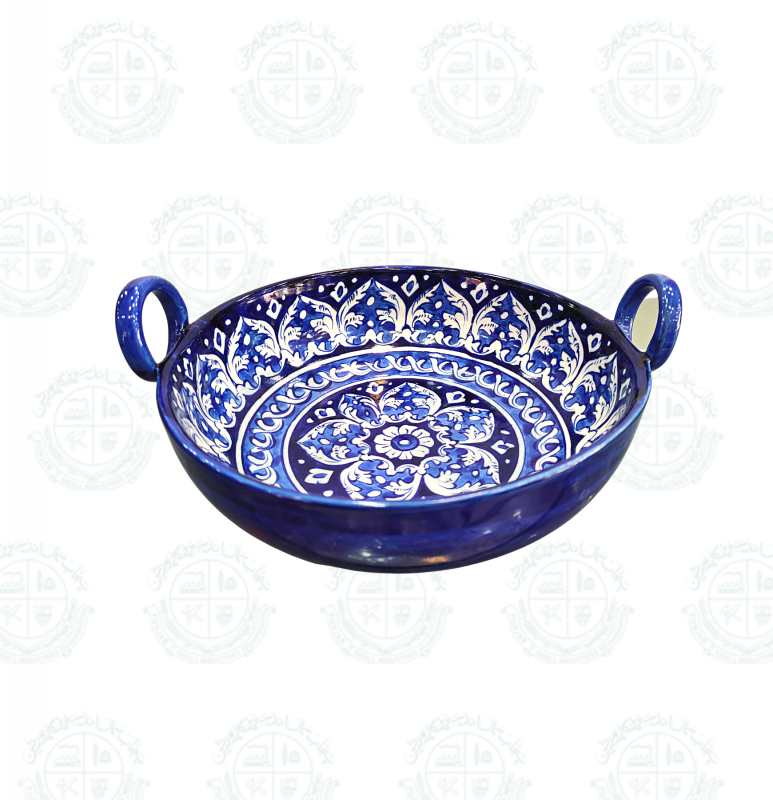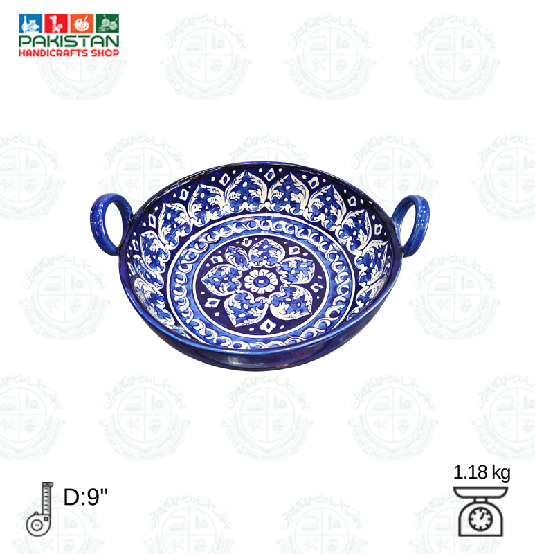 Base Shape is made in ceramics. Tones of blue colors are applied to decorate the artifacts with traditional floral motifs. Sometimes deep yellow is added for creating interest. Presently with the introduction of hotel ware crockery, designs are customized & henceforth a variety of designs with multiple themes are seen in the market.