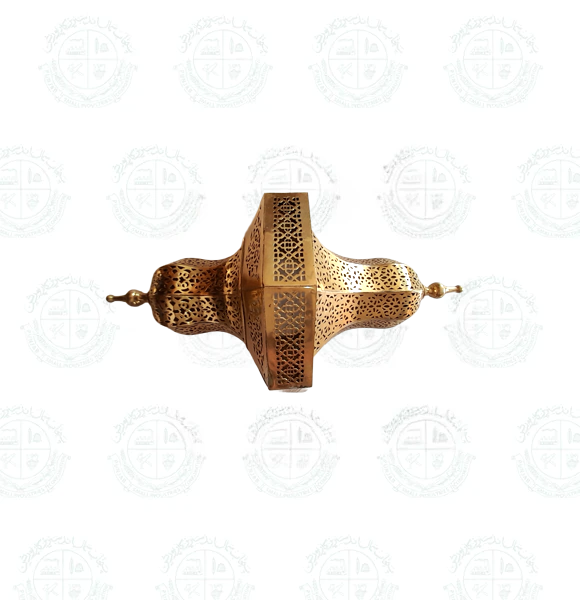 An exquisite golden brass fanoos featuring intricate cutwork, handcrafted by skilled Pakistani artisans. Its detailed design creates a warm, timeless glow, making it a perfect addition to traditional décor or a unique gift for special occasions.