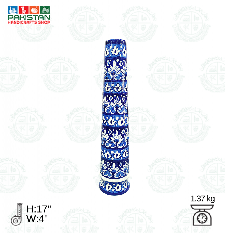 Base Shape is made in ceramics. Tones of blue colors are applied to decorate the artifacts with traditional floral motifs. Sometimes deep yellow is added for creating interest. Presently with the introduction of hotel ware crockery, designs are customized & henceforth a variety of designs with multiple themes are seen in the market.